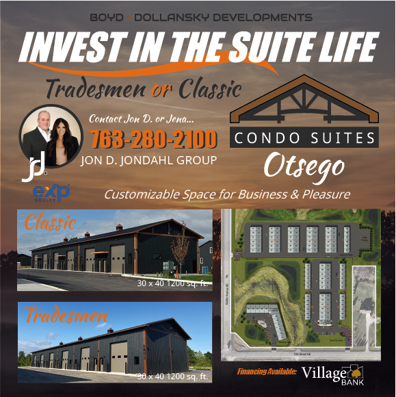 The Condo Suites Otsego, when fully developed will consist of 14 commercial buildings with 3 unit styles: Trades, Classic and Luxury. Trades suites are geared toward contractors and other trades businesses. Classic suites are super spaces for non-retail and small businesses needing additional room. Luxury suites will provide more square footage, amenities and selection options. All suites are personally owned and fully customizable spaces, for your business, storage or hobby.